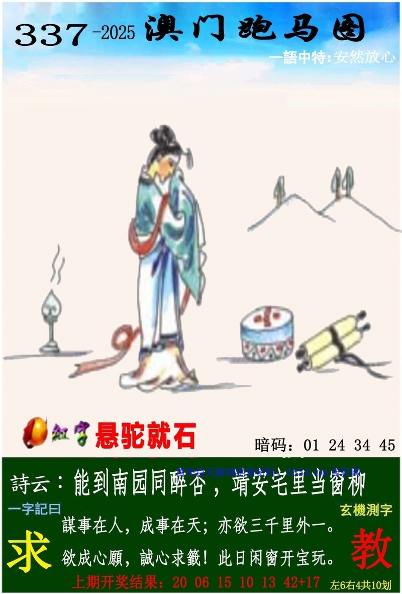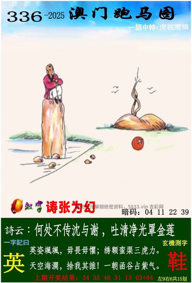| 334期:【一字記曰】《悠》 消遥自在,悠然自得;云头红上三竿日。 自成一角,懶理得失!戴胜谷谷催春耕。 玄机测字:《祥》 解:云头红上三竿日:三竿日解日肖兔龙蛇马羊猴 综合取肖:兔龙蛇马羊猴 |